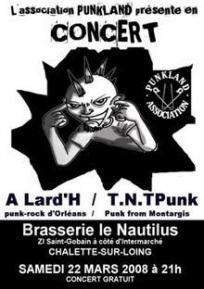 TNT (Montargis) et A Lard'H (Orléans) seront en concert le 22 mars prochain à la brasserie Le Nautilus de Châlette sur Loing, à l'Est du Loiret. Ce concert est organisé, cette fois encore, par la dynamique association Punkland. L'entrée sera gratuite.